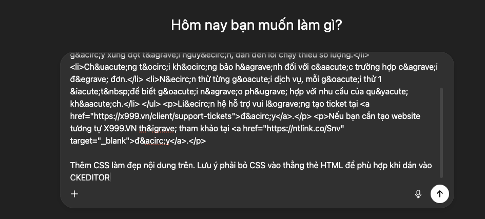 Bước 2: dán nội dung trên vào Chat GPT kèm theo Prompt như sau “Thêm CSS làm đẹp nội dung trên. Lưu ý phải bỏ CSS vào thẳng thẻ HTML để phù hợp khi dán vào CKEDITOR”. Có thể yêu cầu nó làm theo ý bạn ví dụ có khung viền, màu sắc, kiểu thiết kế,…