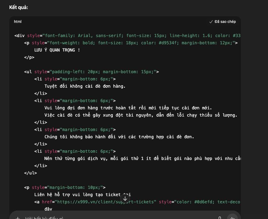 Bước 3: sau khi AI tạo ra kết quả, sao chép HTML dán vào thay thế nội dung HTML thông báo gốc.