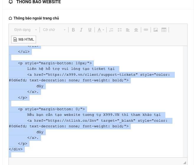Bước 1: nhấn vào nút HTML sau đó sao chép HTML nội dung thông báo ban đầu cần làm đẹp.