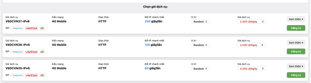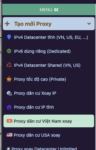 Bước 2: Tại menu Tạo mới Proxy, quý khách chọn vào Proxy dân cư Việt Nam xoay.