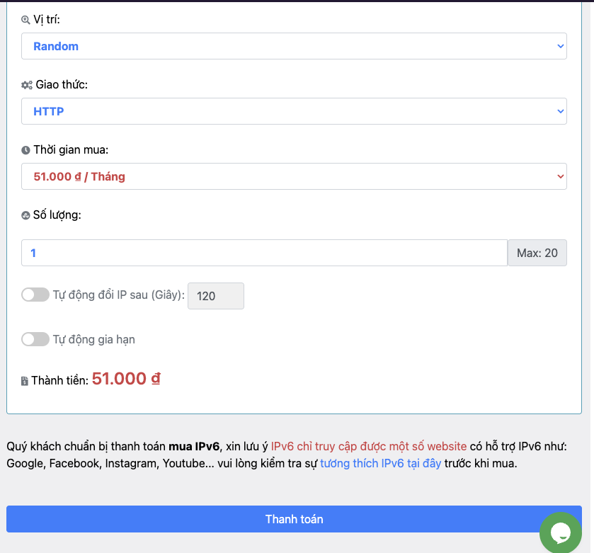 Bước 4: Chọn giao thức HTTP và không được tích vào Tự động đổi IP nhé, quý khách nên tích Tự động gia hạn để không bị gián đoạn Proxy.