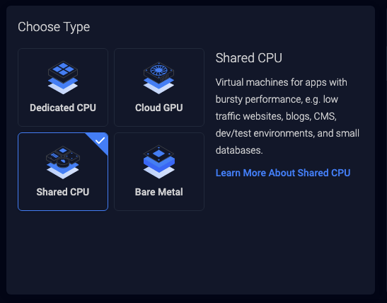 Bước 3: ở phần Choose Type chọn Shared CPU.