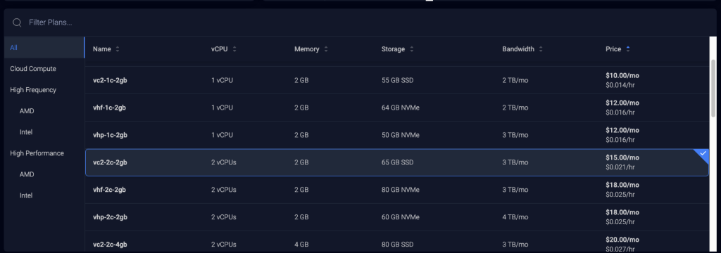 Bước 5: ở phần Filter Plans, bạn chọn gói vc2-2c-2gb như hình dưới.