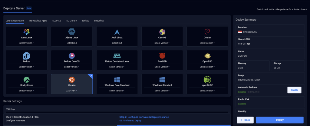 Bước 7: chọn hệ điều hành Ubuntu 22.04 như ảnh dưới, sau đó nhấn vào nút Deploy bên góc phải màn hình.