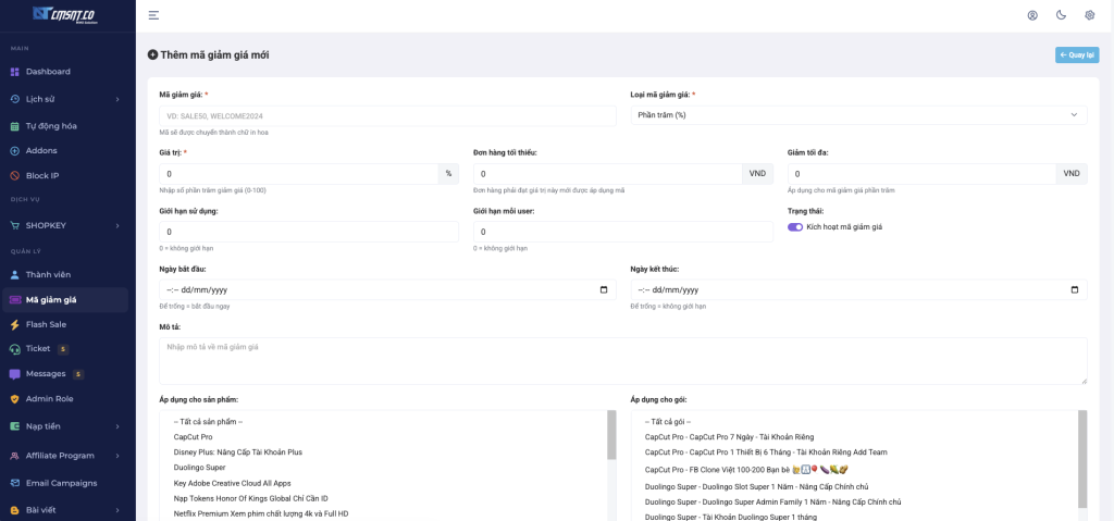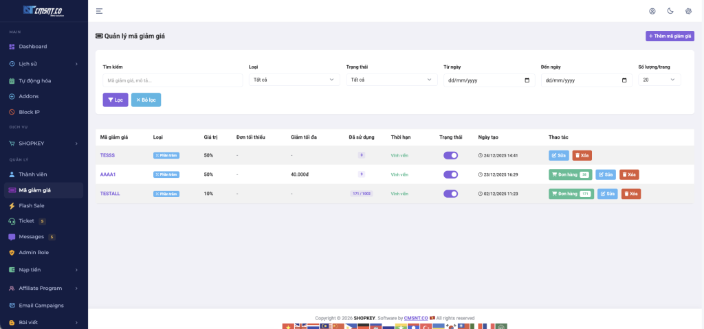 Trang quản trị → SHOPKEY → Mã giảm giá