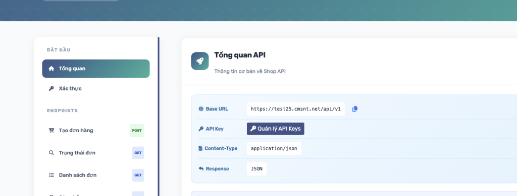Bước 2: tại trang tài liệu API, nhấn vào nút Quản lý API Keys