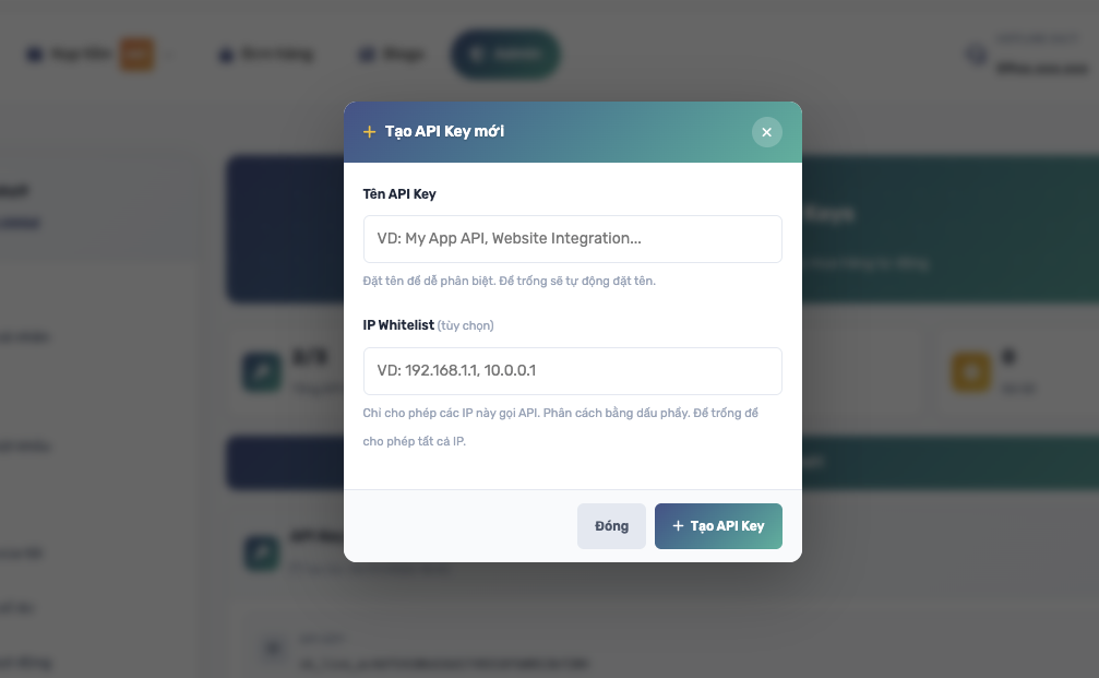 Bước 4: nhấn vào nút Tạo API Key
