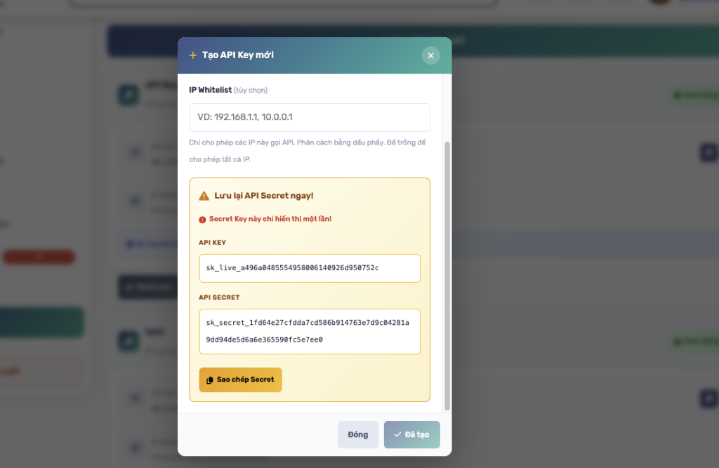 Bước 6: sao chép API KEY và API SECRET