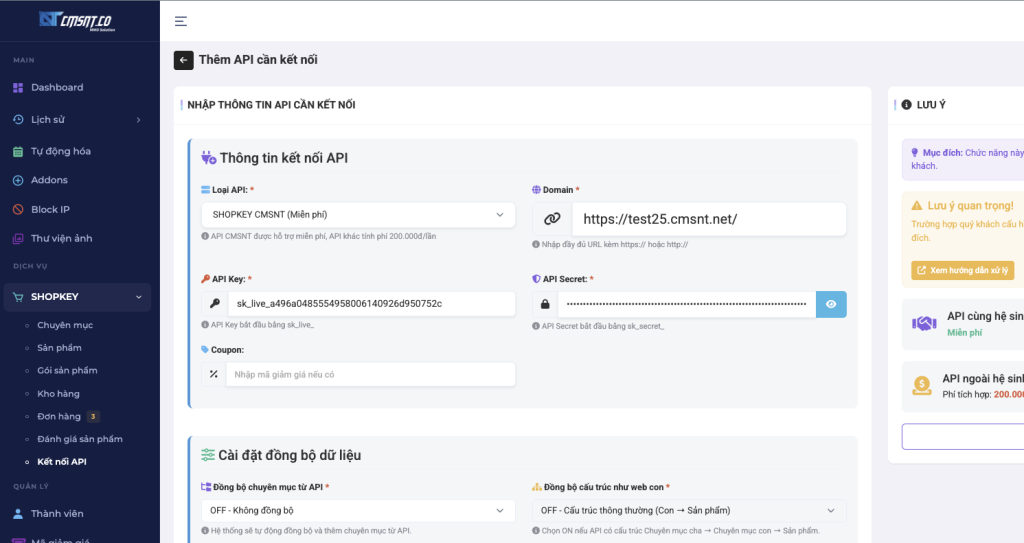 Bước 7: truy cập vào trang kết nối API tại website bạn -> nhấn vào nút Thêm website API -> nhập loại API = SHOPKEY và nhập API Key và API Secret mà bạn đã lưu ở trên vào ô tương ứng.