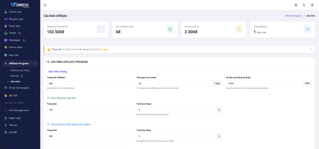 ⚠️ Chú ý: Khi có yêu cầu rút tiền mới, hệ thống sẽ hiển thị thông báo trên trang Cấu hình. Nhấp
