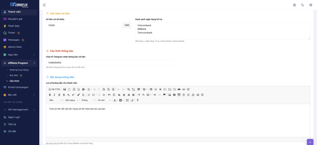 Sử dụng trình soạn thảo để viết hướng dẫn/chính sách cho thành viên. Nội dung này sẽ hiển thị trên trang Affiliate