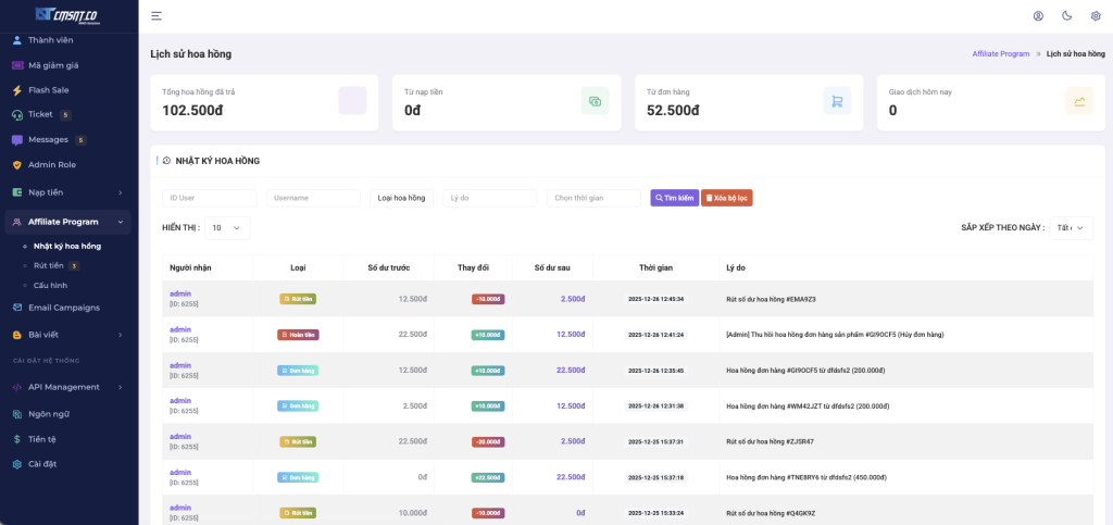 Bộ lọc cho phép tìm theo username, loại hoa hồng, và khoảng thời gian.