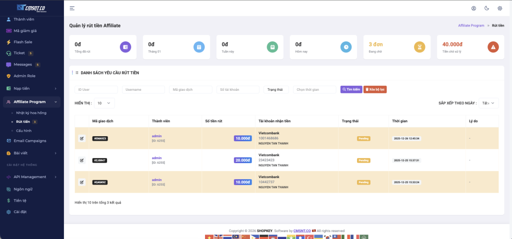 Số tiền rút tối thiểu Số dư hoa hồng tối thiểu để được phép rút. VD: 100.000đ